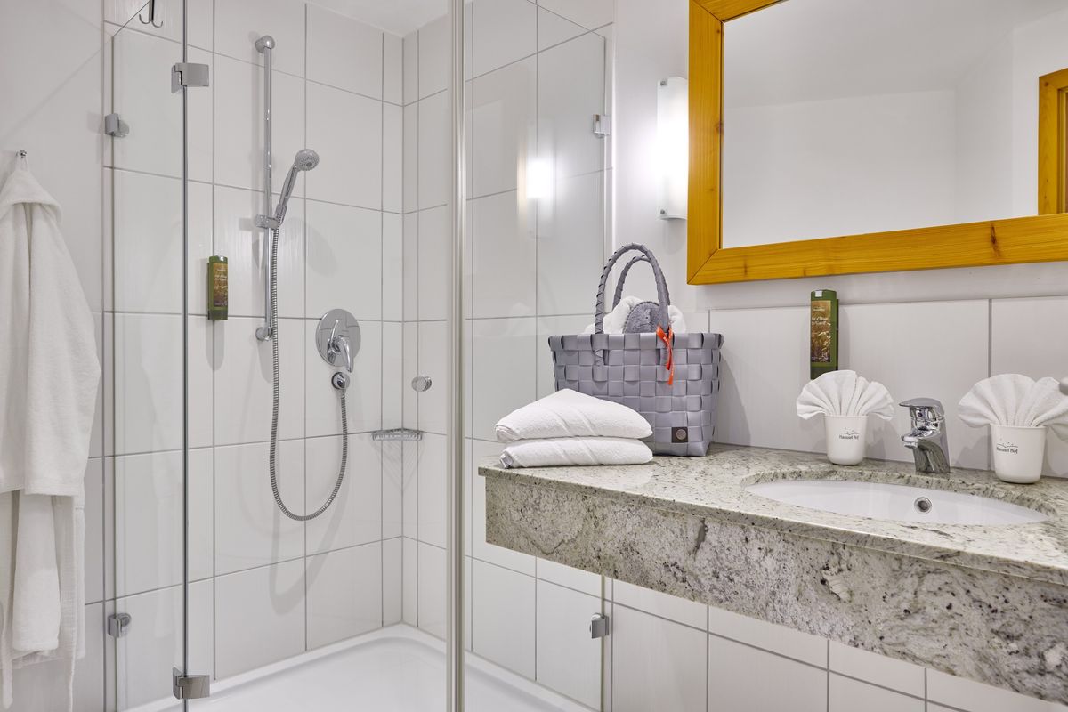 Bad mit Dusche und WC, Haartrockner, Schminkspiegel