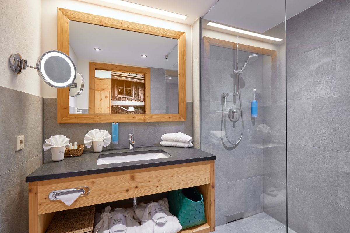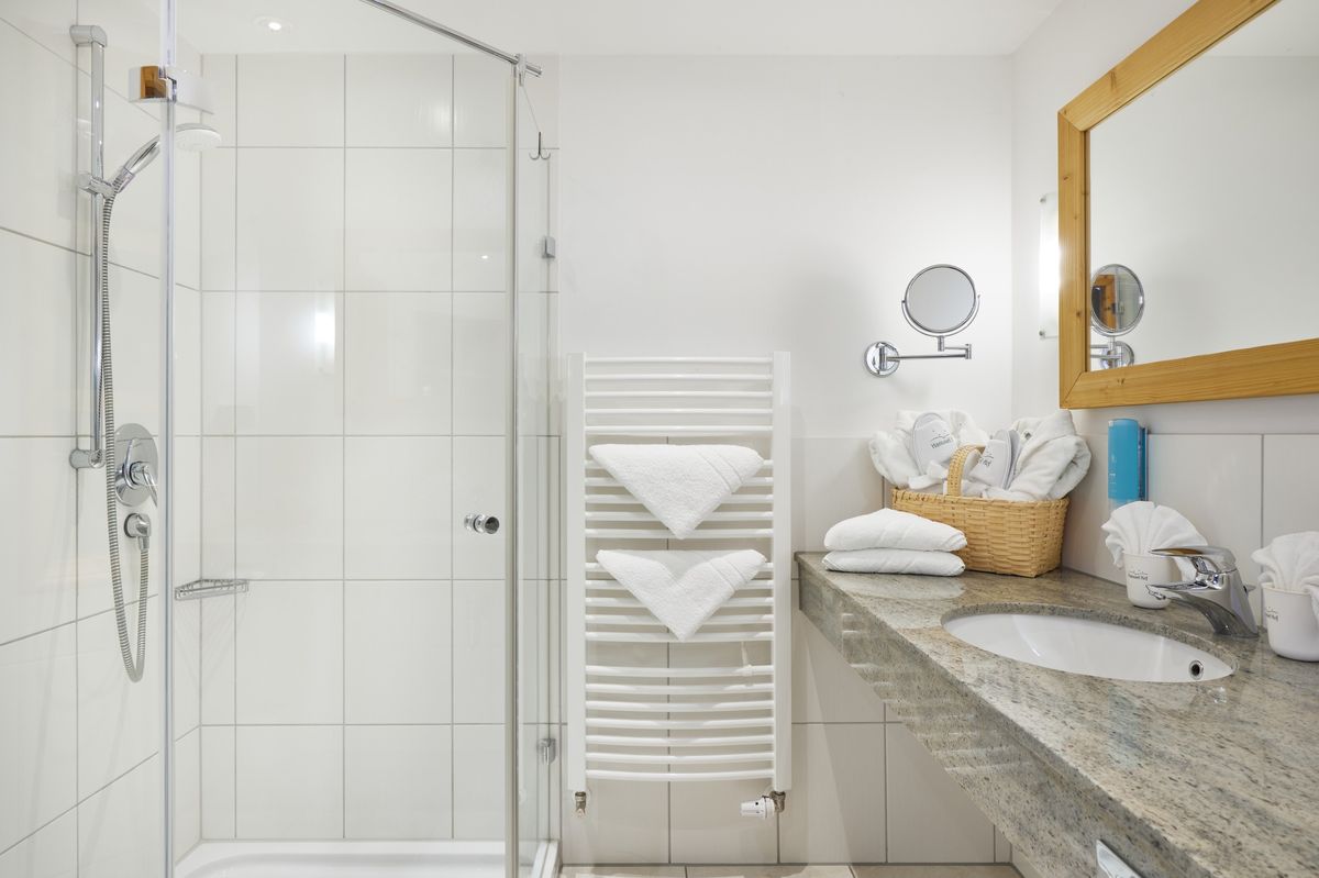 Bad mit Dusche, WC separat, Haartrockner, Schminkspiegel