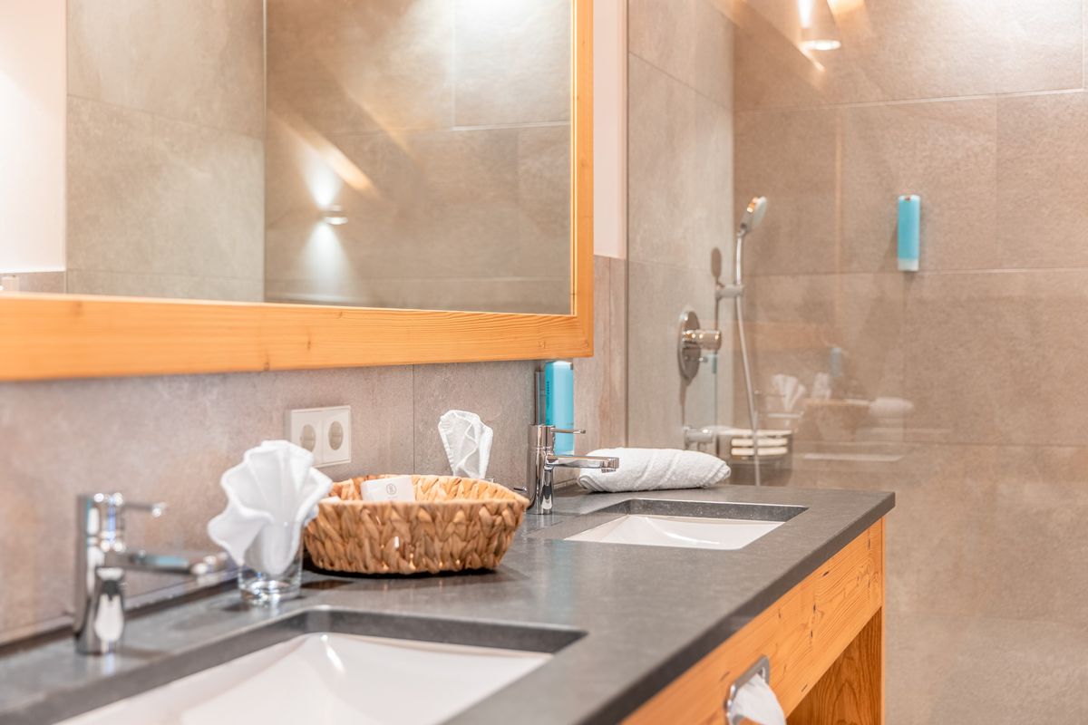 Bad mit Regendusche und Badewanne, Doppelwaschtisch, WC separat, Haartrockner, beleuchteter Schminkspiegel
