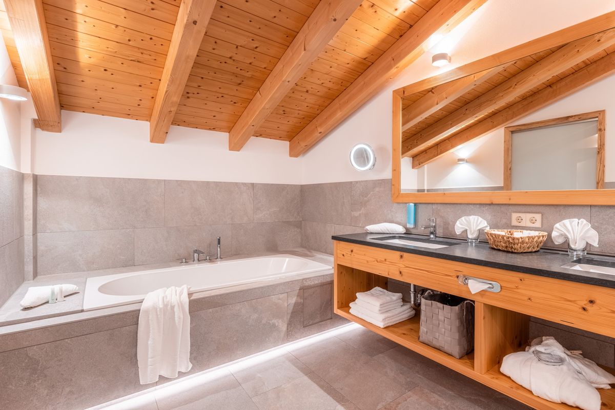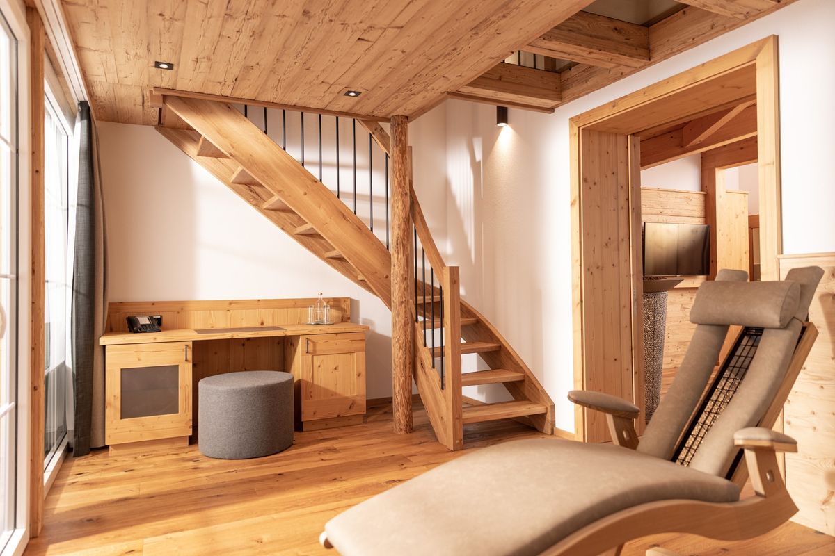 Der perfekte Ort für Ihre Wohlfühlmomente | Exklusiv: ein eigener Whirlpool und Infrarot-Schwebeliegen | Balkon mit Bergblick | Schlafbereich mit TV auf der 2. Ebene | Badezimmer mit Doppelwaschtisch und Regenwalddusche, WC ist separat | Nespressokaffeemaschine und Teestation | Verzehr aus der Minibar inklusiv